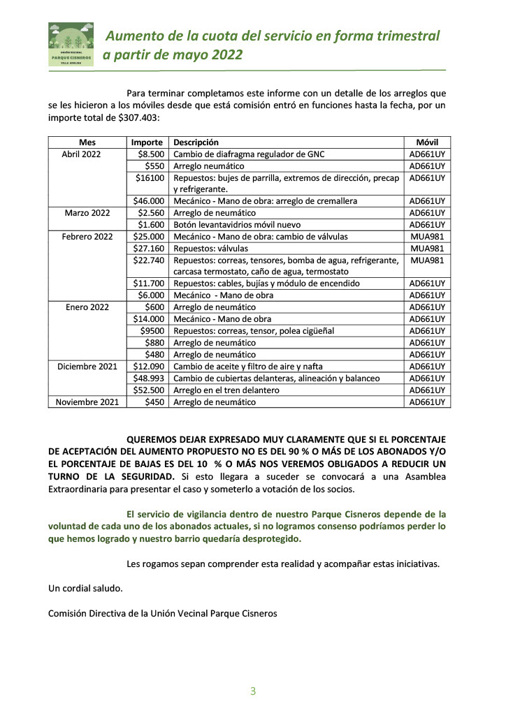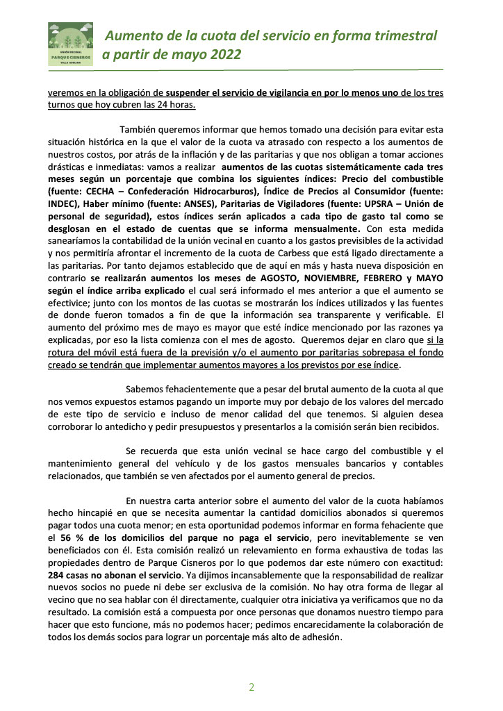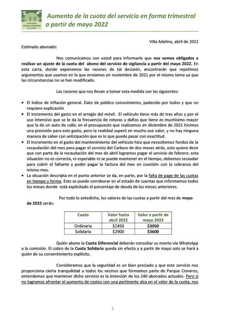 Nos comunicamos con usted para informarle que debemos aumentar la cuota del servicio de vigilancia a partir de mayo 2022 y que se realizarán aumentos sistémáticos cada tres meses sin excepción. Las razones de dichas medida y la forma de cálculo se explican en la carta que enviamos más abajo, la misma también se enviará vía email. Rogamos leerla completa y con atención.